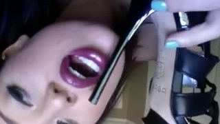 Goth teen in high high-heeled shoes Lydia Black ball gagged and pussy tantalized