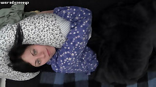 Sleepy Girlfriend in Pajamas Playing with Puffies