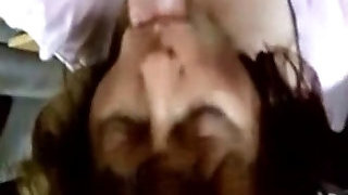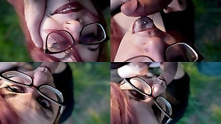 torrid brunette with glasses gets romped in the mouth. Sloppy blowjob, cum on chest