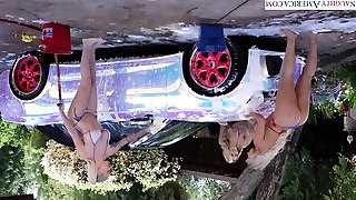 Three hot blondies washed his camper in the bathing suit and rode his dick after