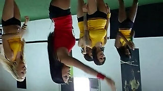 Three Erasmus Schoolgirl hot tight pussy girls in short cut-offs YOGA bend overs with slight fails and oops at home after lingerie try on day