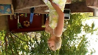 Pleasureable ash-blonde girl toys her tight ass in a backyard